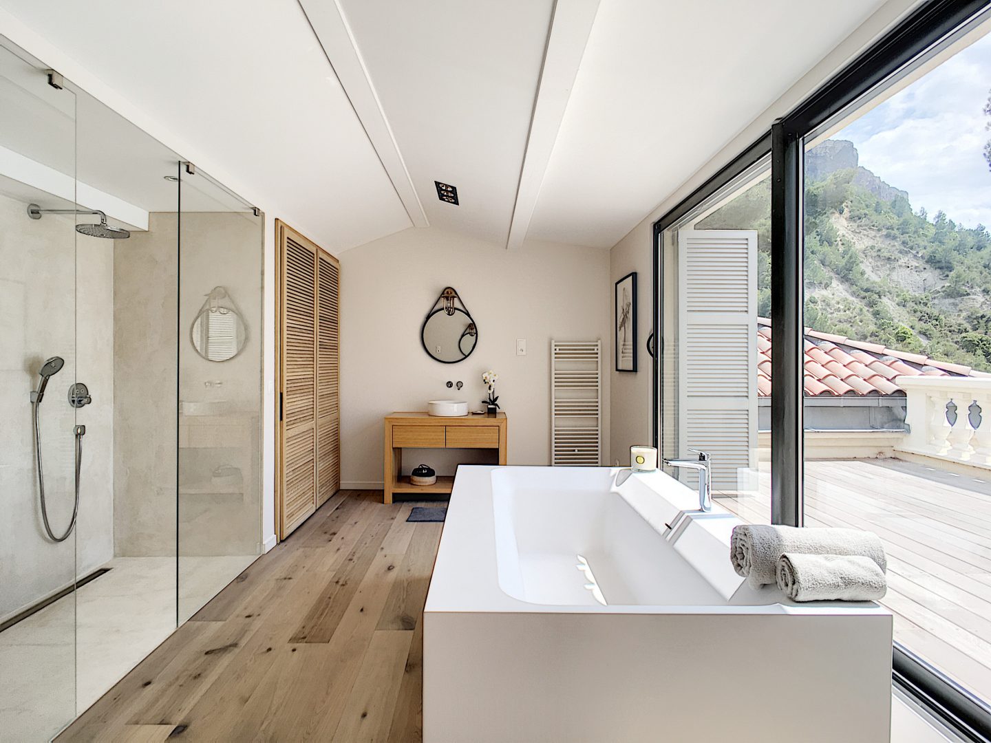 Prestigieuse villa sur la Côte d’Azur de 600 m² située dans le parc national des Calanques à Cassis, rénovée en 201, prévue pour 24 personnes. L’immense terrasse de 500 m2 surplombe la plage, accessible à pieds par un chemin privé en moins de 5 minutes. Le village et le charmant port de Cassis sont à moins de 15 minutes à pied également. La villa principale offre une suite parentale vue mer de 90m2 avec bureau et salle de bain/douche incluant deux terrasses privatives ainsi que 8 chambres avec salle de douche vue mer ou vue jardin plus une chambre salon/dortoir. De plus, à l’entrée du domaine, un pavillon indépendant de la villa permet de loger 6 personnes complémentaires avec une suite (en supplément) et deux chambres, soit une location possible au total pour 26 personnes, petit déjeuner inclus.